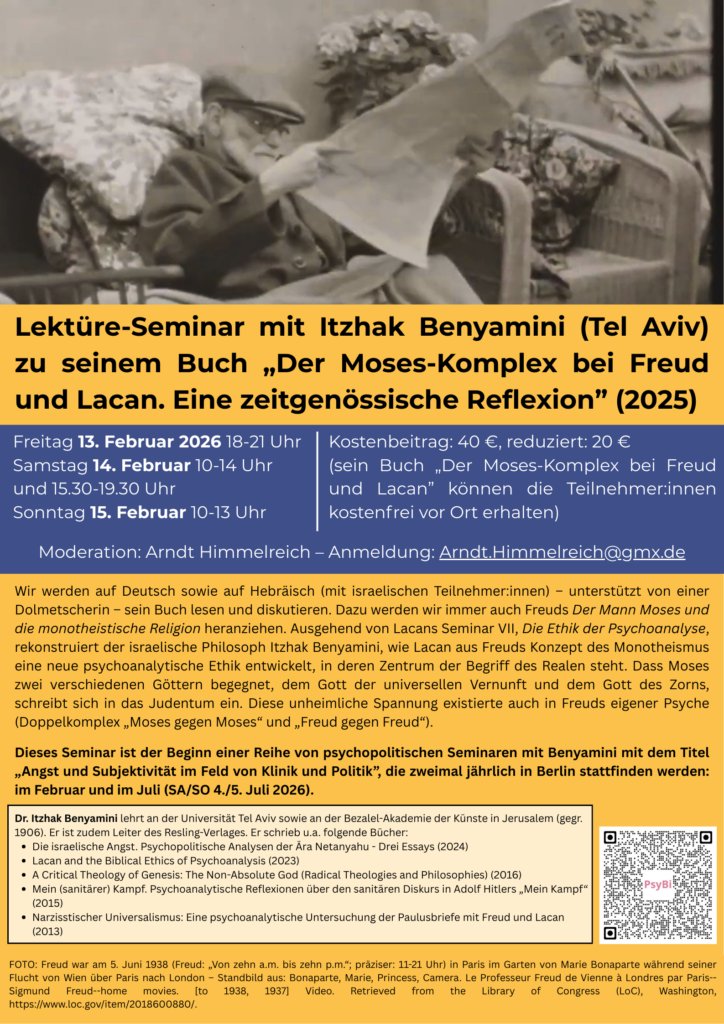 Wir werden auf Deutsch sowie auf Hebräisch (mit israelischen Teilnehmer:innen) – unterstützt von einer Dolmetscherin – sein Buch lesen und diskutieren. Dazu werden wir immer auch Freuds Der Mann Moses und die monotheistische Religion heranziehen. Ausgehend von Lacans Seminar VII, Die Ethik der Psychoanalyse, rekonstruiert der israelische Philosoph Itzhak Benyamini, wie Lacan aus Freuds Konzept des Monotheismus eine neue psychoanalytische Ethik entwickelt, in deren Zentrum der Begriff des Realen steht. Dass Moses zwei verschiedenen Göttern begegnet, dem Gott der universellen Vernunft und dem Gott des Zorns, schreibt sich in das Judentum ein. Diese unheimliche Spannung existierte auch in Freuds eigener Psyche (Doppelkomplex „Moses gegen Moses“ und „Freud gegen Freud“).